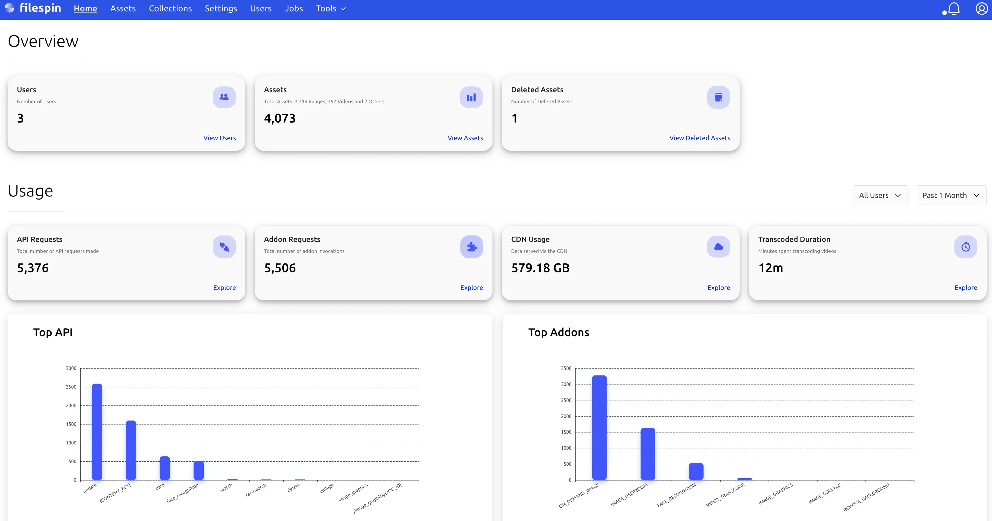 We’re excited to announce the launch of comprehensive Usage Monitoring in the Web Dashboard. Built for account administrators, this new dashboard delivers real-time visibility into your usage of FileSpin that includes API, Addons, CDN and more — all visualized through intuitive graphs and metrics.