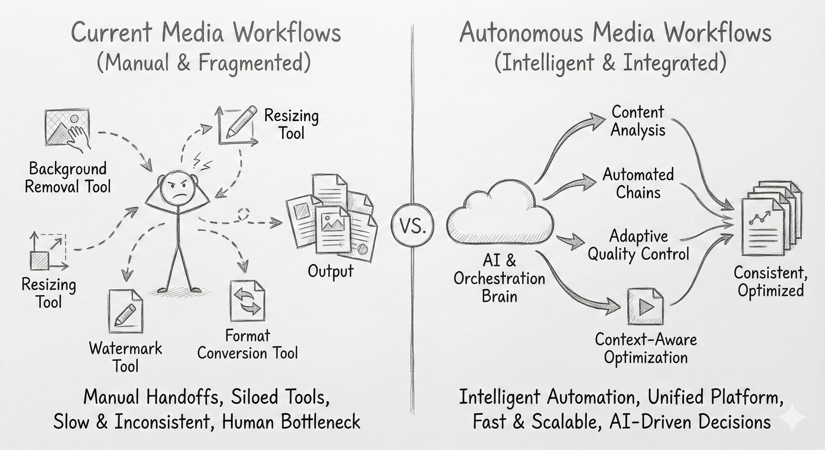 Every workflow requires human judgment: Which images need background removal? What quality level? Which format? Where does output go? For enterprises processing thousands of daily assets across multiple brands and channels, decision-making becomes the bottleneck.