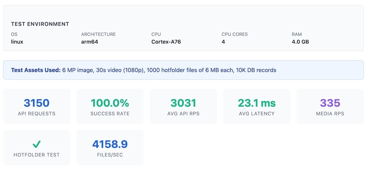 The Pi performed remarkably well. So did Teleport. The asset APIs were all under 10 milliseconds for 10 concurrent API clients sending hundreds of requests per second. For image transformations, Teleport + Pi 5 handled dynamic image resizing incredibly well – image gallery pages with thumbnails loaded instantly. Video streaming range requests were even faster. Perhaps no serious enterprise is going to run its media platform on a Raspberry Pi. However, if I ran operations on the ground for events, media kiosks, or any other media workflow that demands local-first operations, I would have Teleport installed on a bunch of Raspberry Pis and a reliable disk or a tiny NAS with its own power.