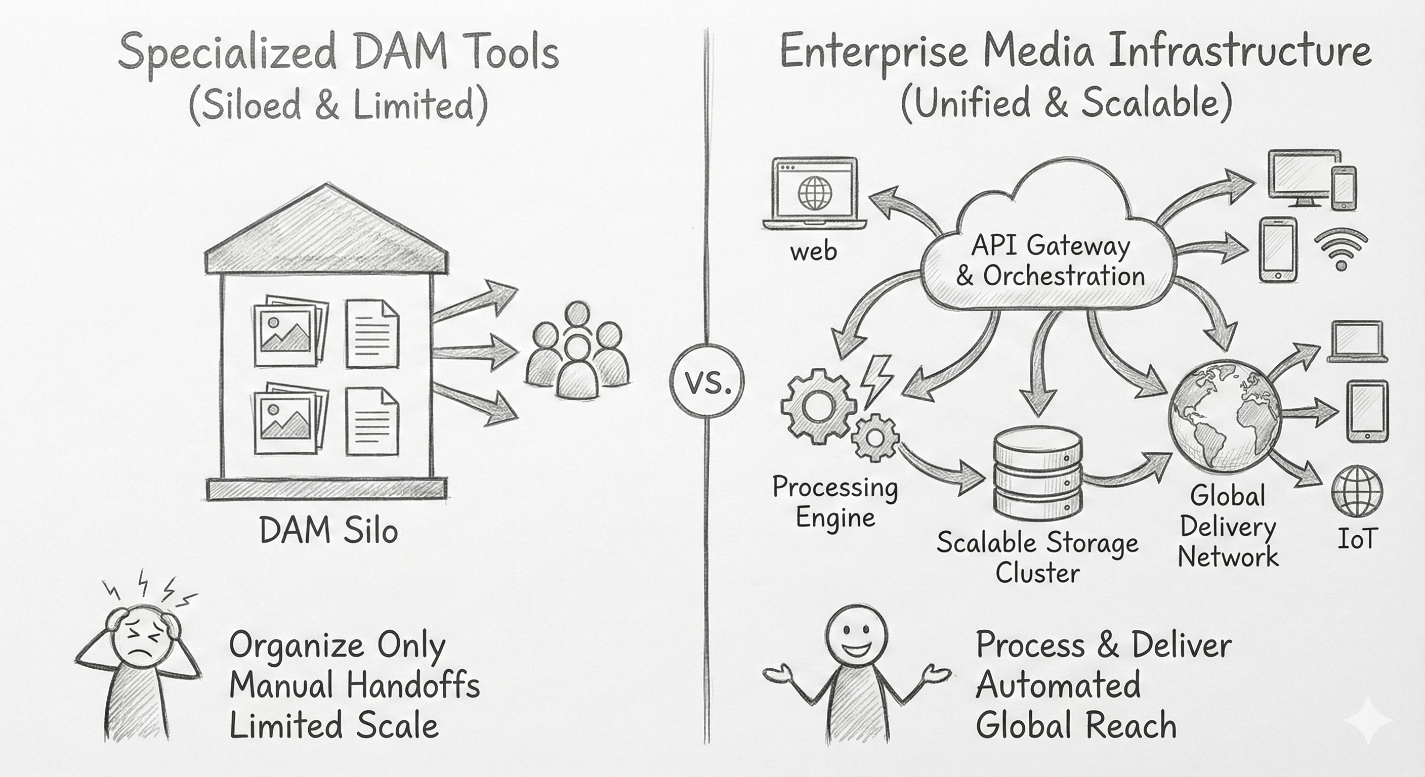 The current DAM landscape forces enterprises into an uncomfortable choice: select a platform optimized for one team's workflow and force everyone else to adapt, or cobble together multiple specialized tools and manage the integration complexity yourself. Developer-focused platforms give engineering teams powerful APIs but lack governance and collaboration features that marketing needs. Brand-centric platforms provide sophisticated marketing tools but treat technical capabilities as secondary concerns. Creative collaboration tools excel at asset tracking but weren't built for high-volume, automated processing at scale.
