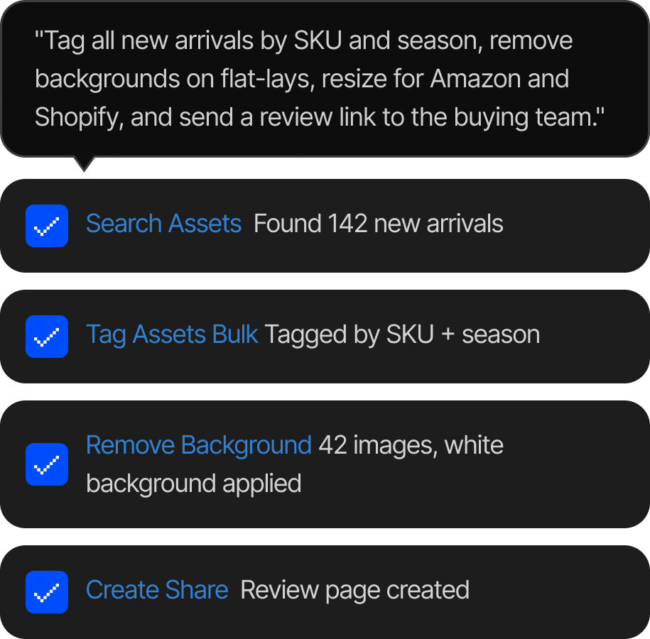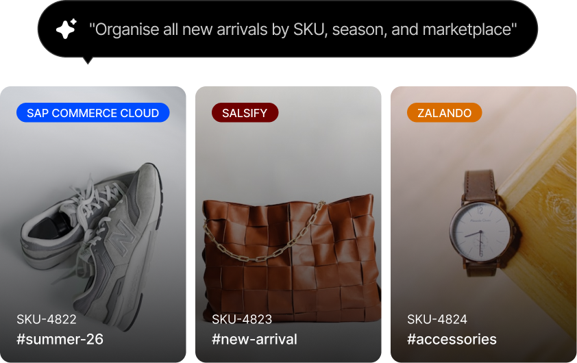 AI-powered search that finds any asset by product, colour, season, or visual similarity. Launch new products and seasonal refreshes without waiting on creative or engineering.